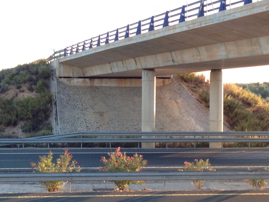 Obra civil de revestimiento de emparchado de estribo de puente en autovía.