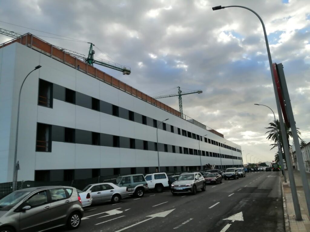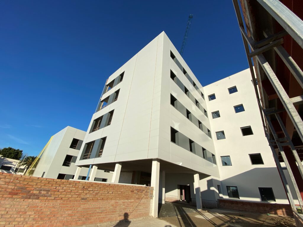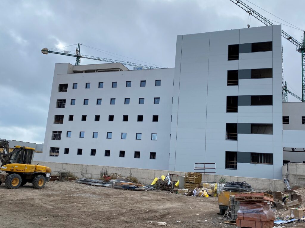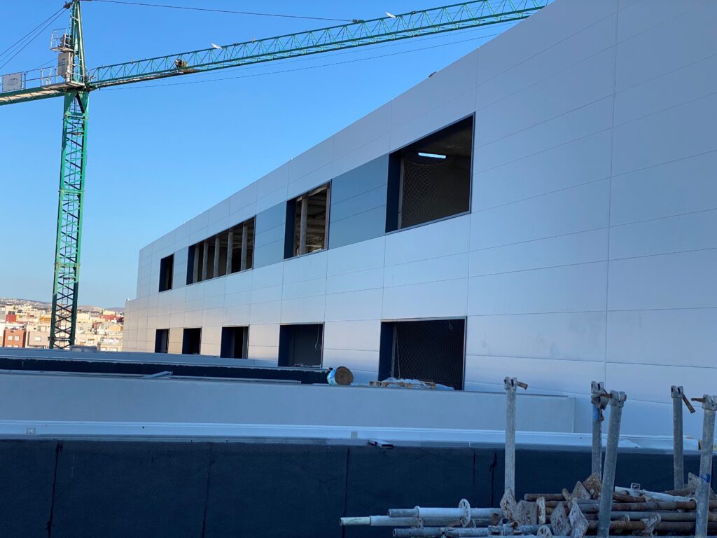 Revestimiento de fachada con panel para construcción de un hospital. La superficie ocupaba más de 8.000 metros cuadrados. Trabajos elaborados de carpintería metálica con rematería en ventanas y en encuentros de fachada.