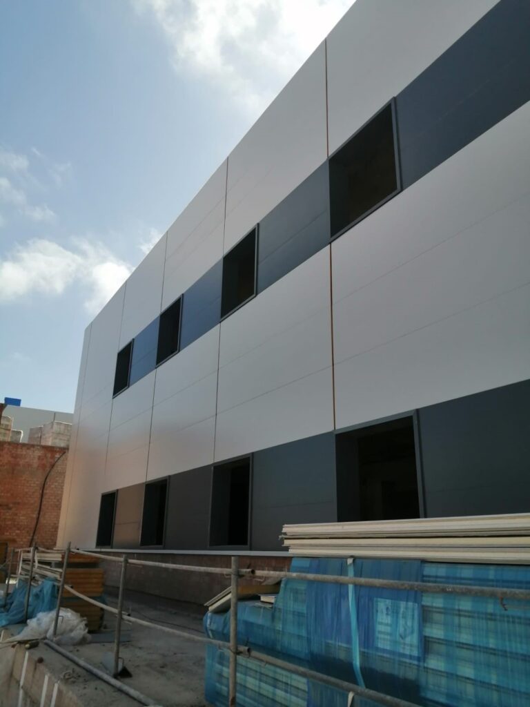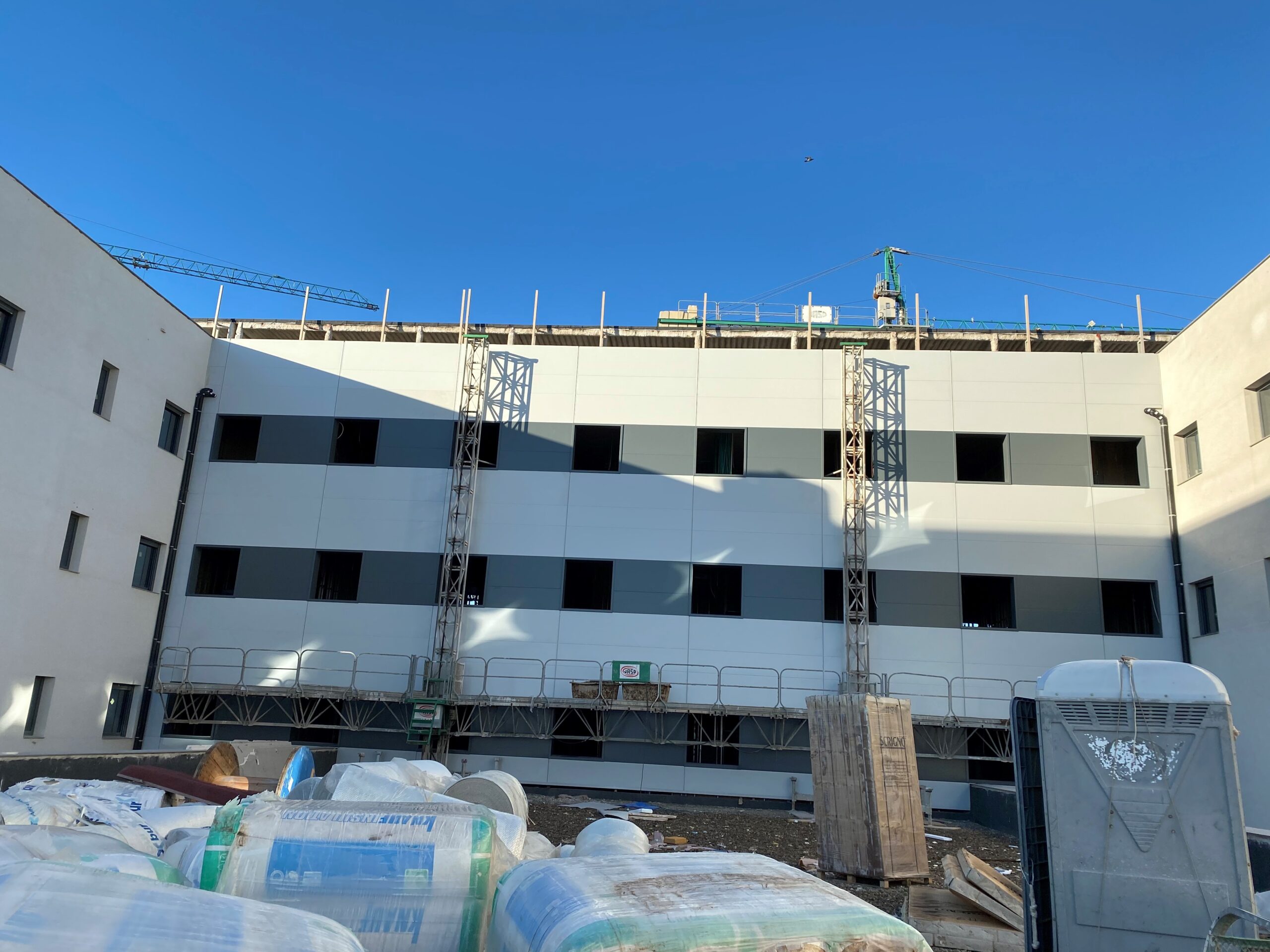 Revestimiento de fachada con panel para construcción de un hospital. La superficie ocupaba más de 8.000 metros cuadrados. Trabajos elaborados de carpintería metálica con rematería en ventanas y en encuentros de fachada.