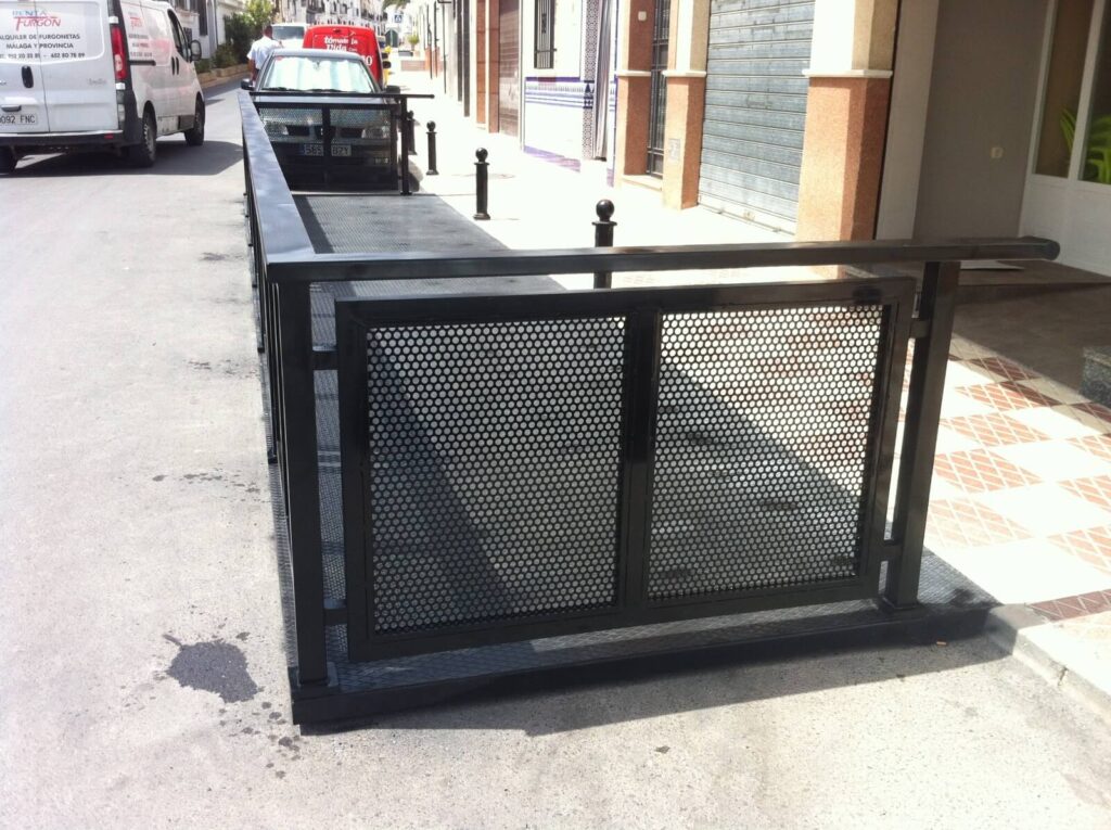 Valla de protección en vial urbano para terraza. Fabricada e instalada en acero termolacado. Metalcon puede realizar estas estructuras con acabado en termolacado, acero inoxidable o aluminio. La estructura es desmontable y no requiere cimentación. Presenta una gran robustez y resistencia.